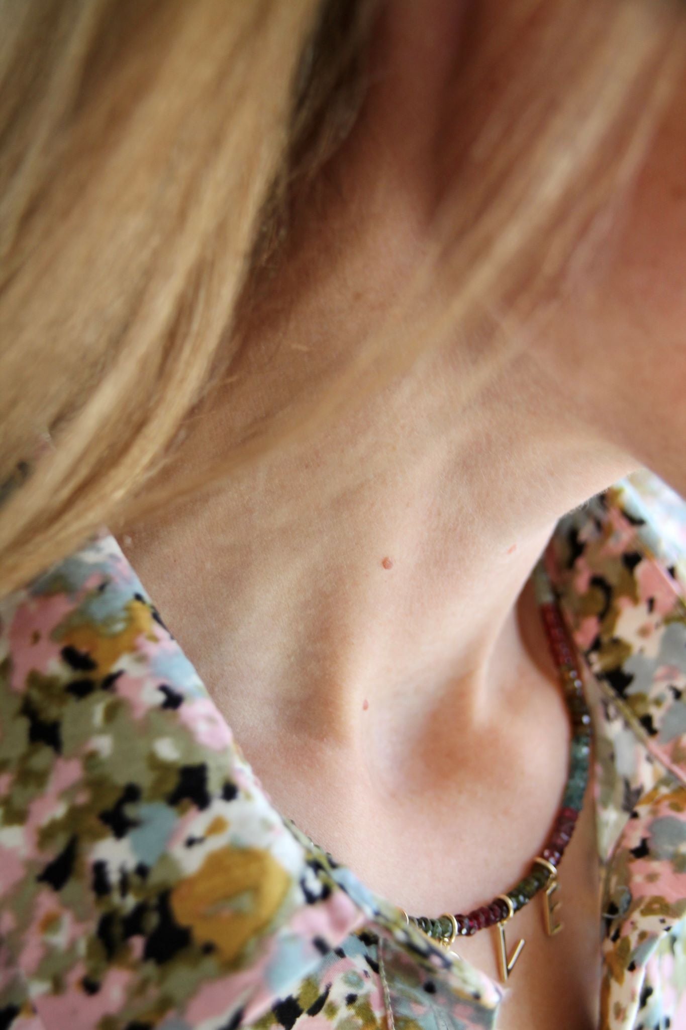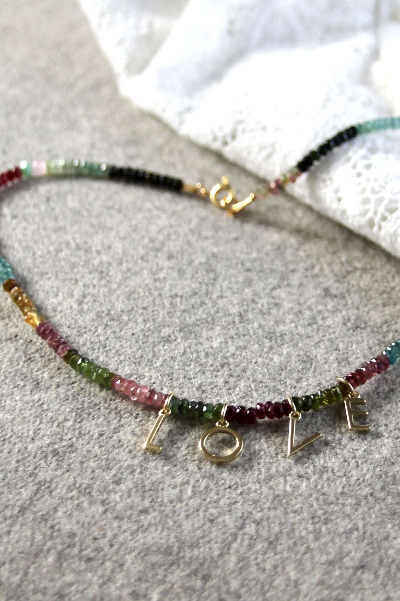 YOU ARE LOVED: Für die Kette verwenden wir eine Mischung von Edelsteinen: Turmalin, Rubin und Granat, außerdem facettierte Glassteine und Glassterne. Die Steine und Glasperlen sind circa 3-4 mm breit. Der Verschluss besteht aus 925er Silber, welches mit 24 Karat Gold überzogen ist.