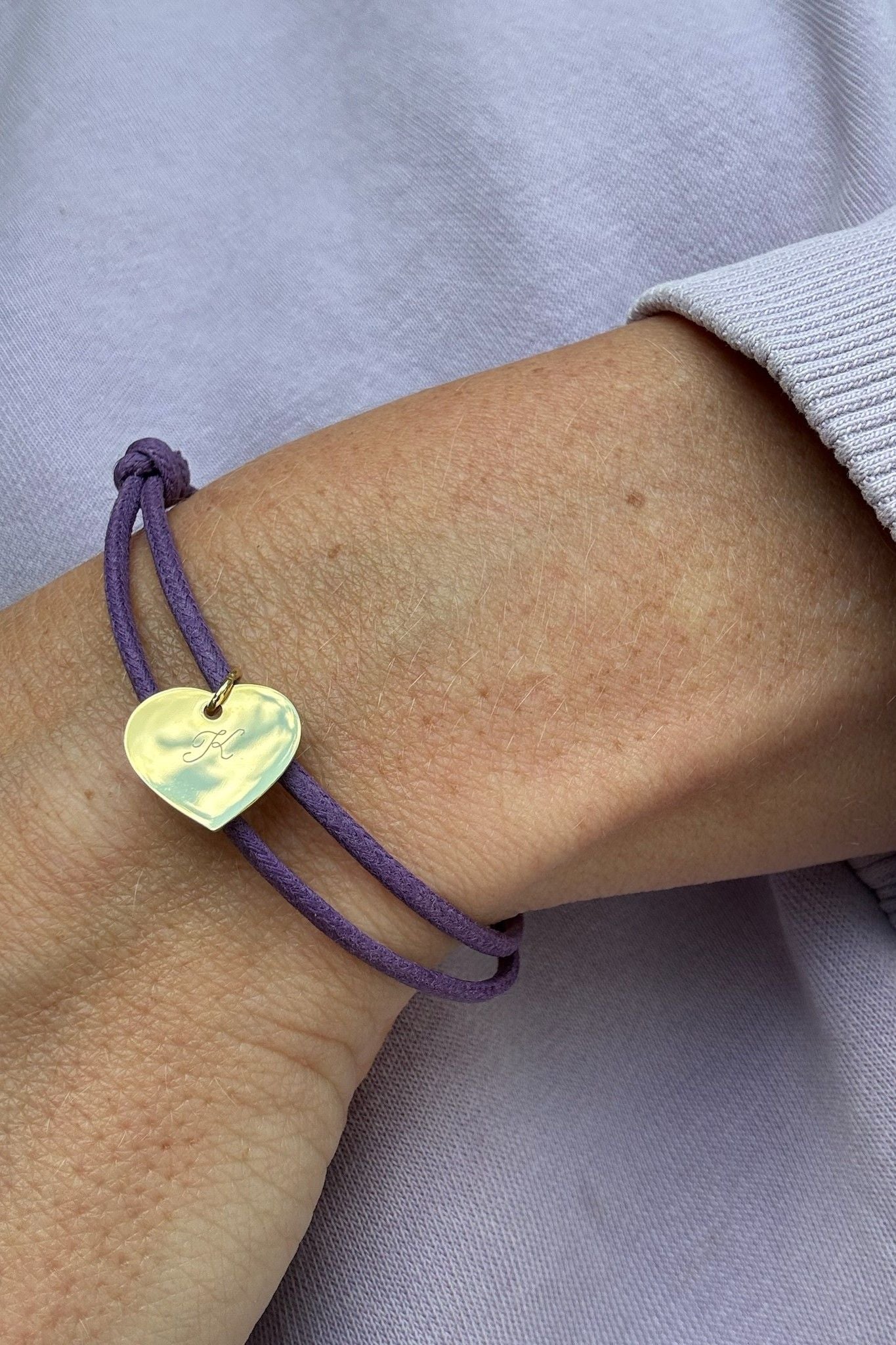 Hier siehst Du ein lilanes Stoffarmband mit unserem 14mm Herz als Anhänger. Das Herz kann auf der Vorderseite mit einem Initial oder Namen graviert werden. Lass uns Deinen Gravurwunsch gerne beim Check Out Prozess im Kommentarfeld wissen. Wie wäre das Armband als Mama - Tochter - Glücksbringer? Schau mal bei den Kinderarmbändern vorbei und shoppe das Armband im Mini Me Look zB mit einem kleinen Herzen!