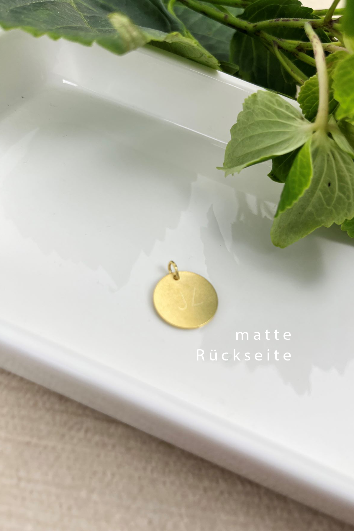 Anhänger: Das runde Plättchen hat einen Durchmesser von 14 mm und 0.6 mm Stärke. Vorne ist das Plättchen poliert, hinten matt. Die Gravur erfolgt automatisch auf der Vorderseite.