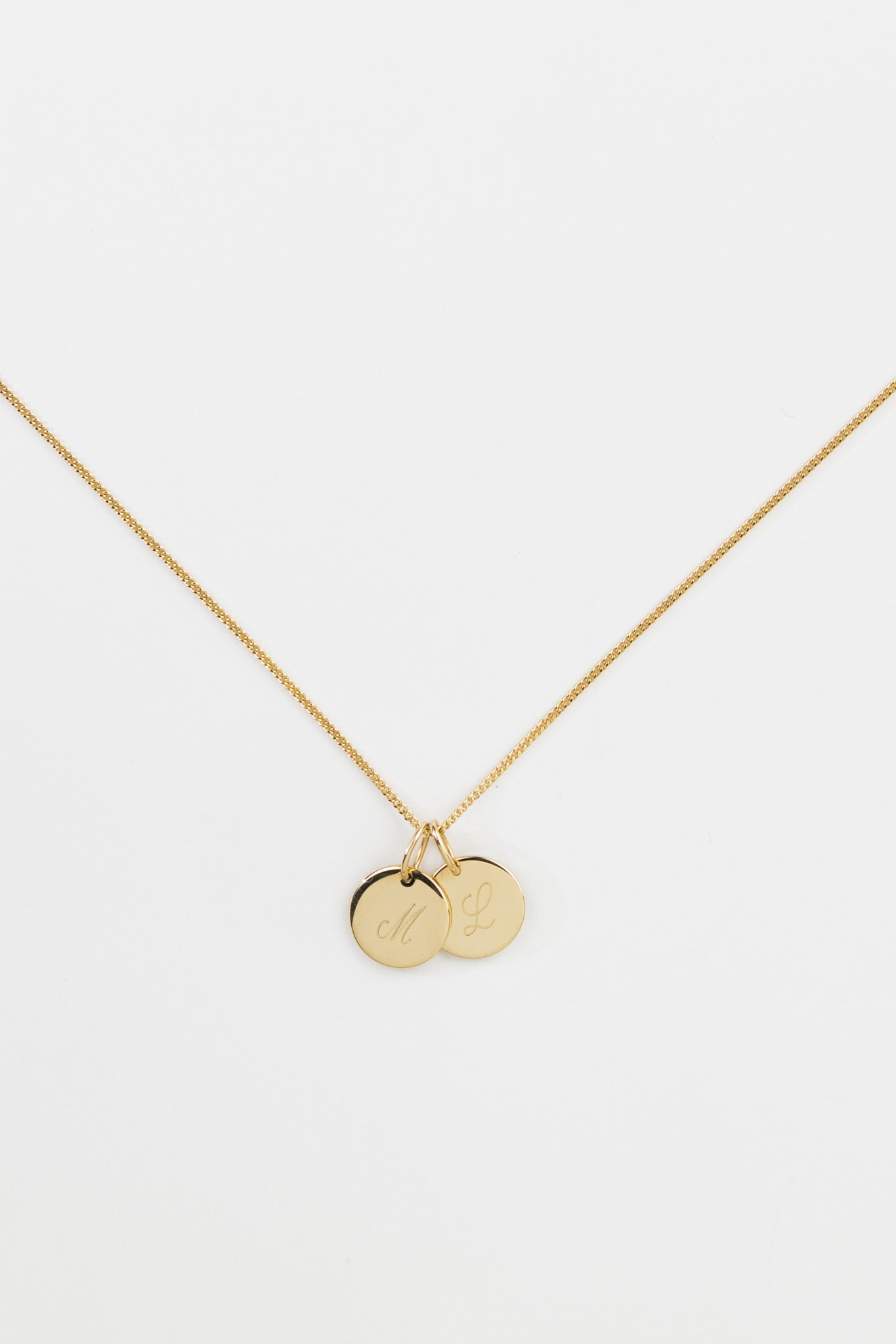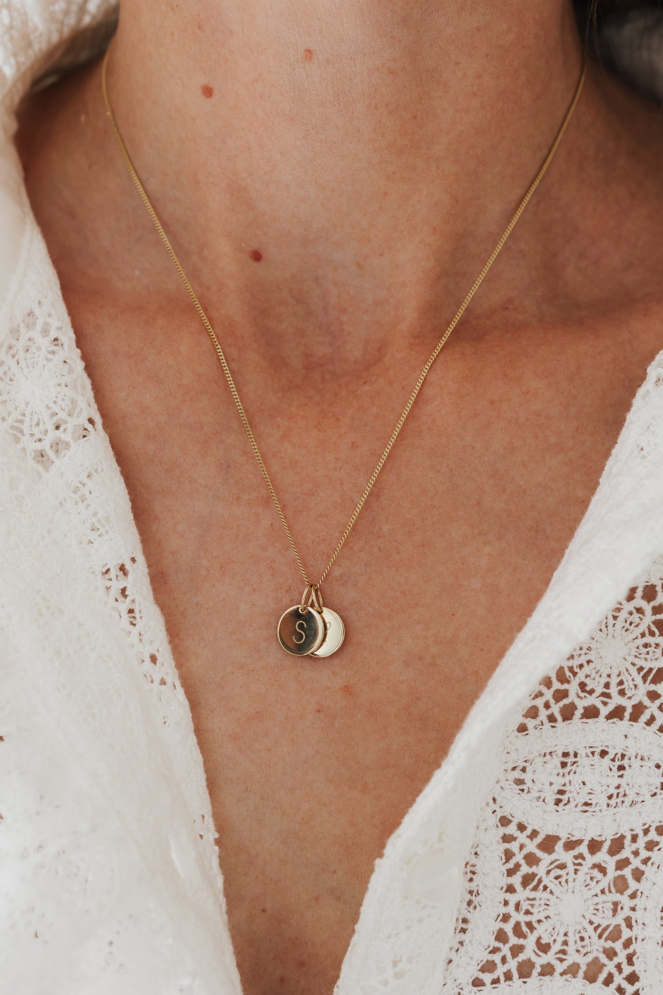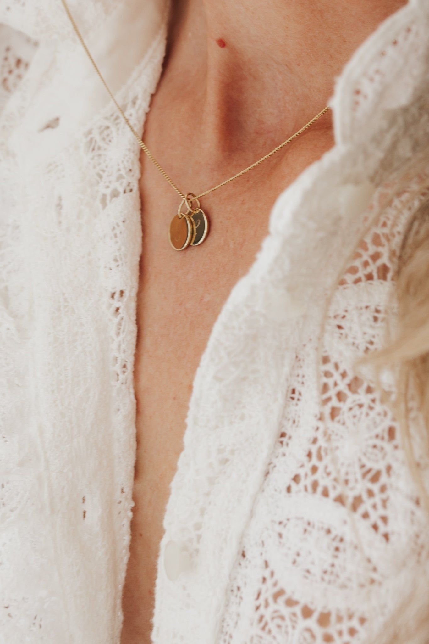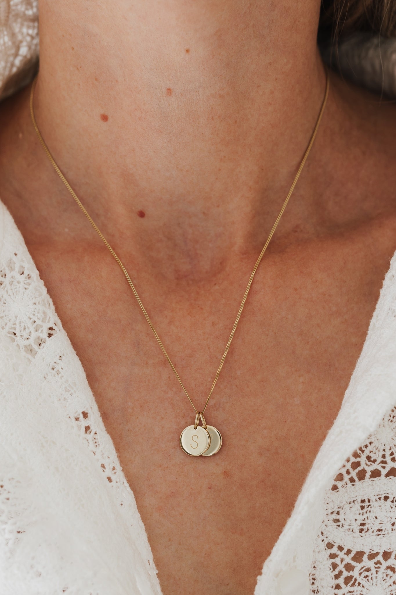 Anhänger: An der Kette sind zwei runde Anhänger befestigt. Die runden Plättchen haben einen Durchmesser von 10 mm und eine Stärke von 1 mm. Die von uns ausgewählte Stärke der Plättchen verleiht den Anhängern eine besonders hochwertige Haptik. Vorne sind die Plättchen poliert, hinten matt. Die Gravur findet automatisch auf der Vorderseite statt.