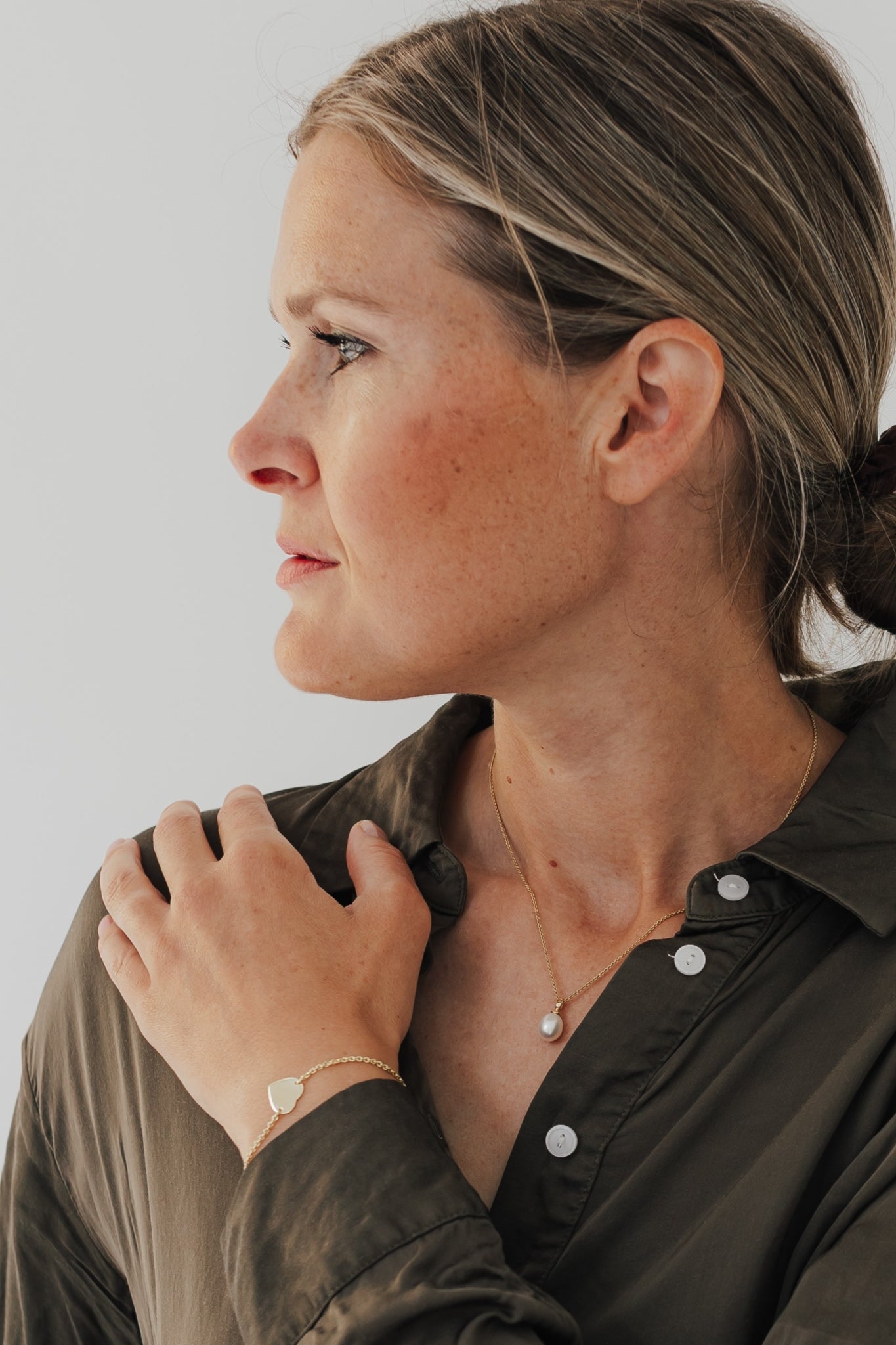 Willkommen bei unserer Kette SMALL PEARL: Ein dezenter Hingucker, ein Statement der Eleganz. Eine kleine Süßwasser-Zuchtperle mit Öse aus recyceltem 8k Gold ziert unsere kurze, filigrane Ankerkette.