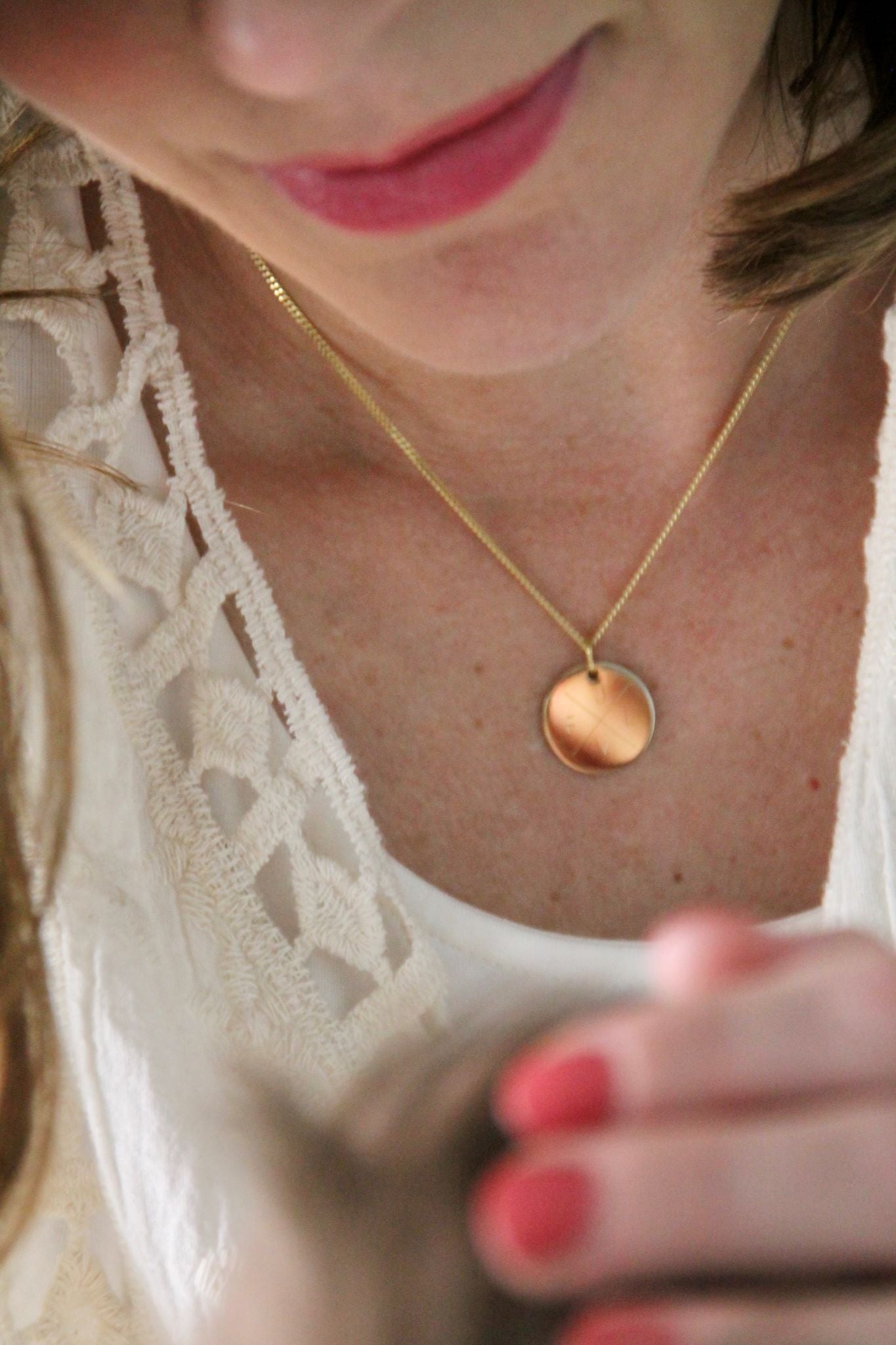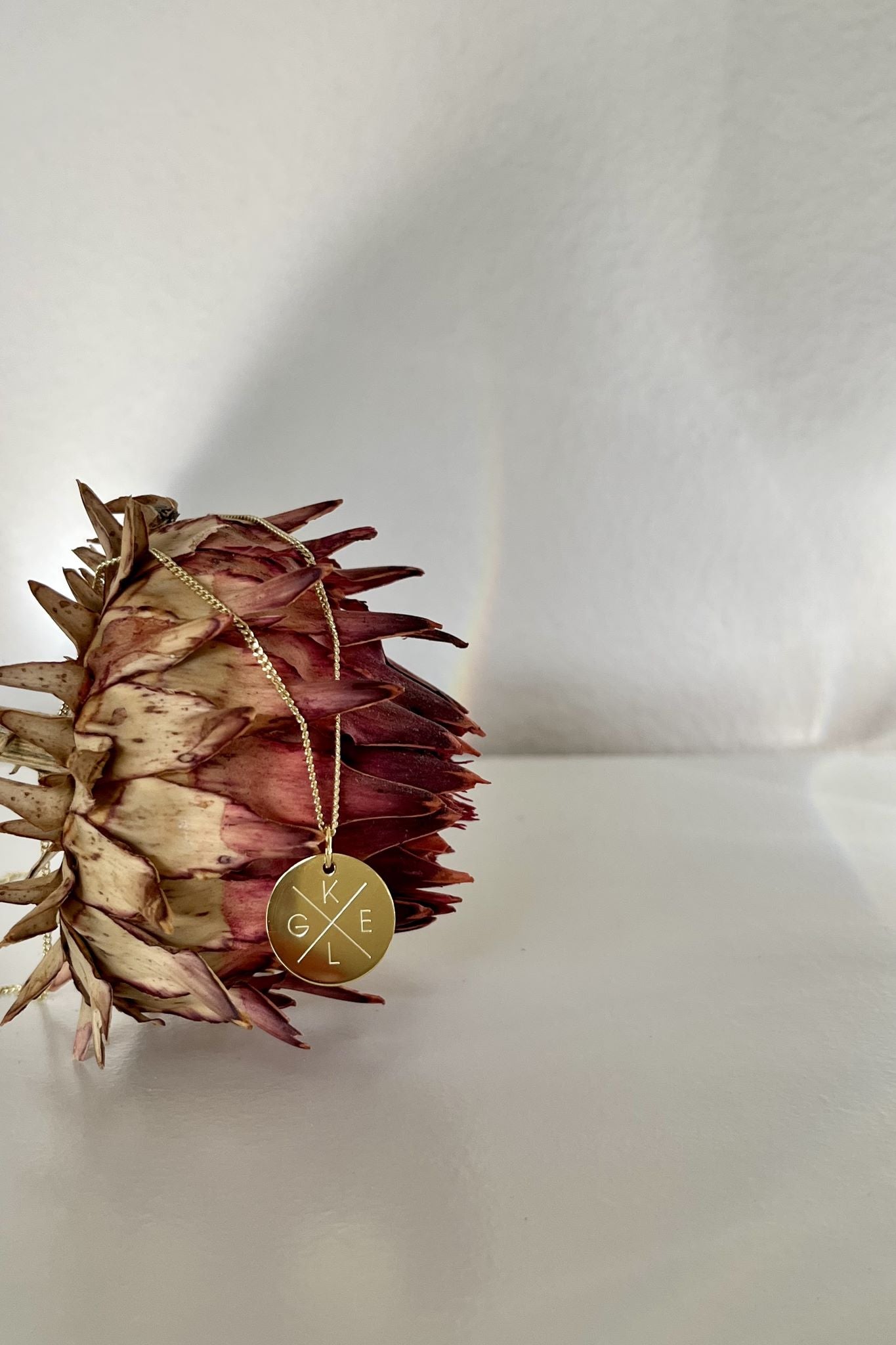 Anhänger: Der Anhänger hat einen Durchmesser von 16 mm und eine Stärke von 0.6 mm. Die Stärke des Plättchens verleiht dem Anhänger eine besonders hochwertige Haptik. Vorne ist das Plättchen poliert, hinten matt. Eine Gravur findet auf der Vorderseite statt.