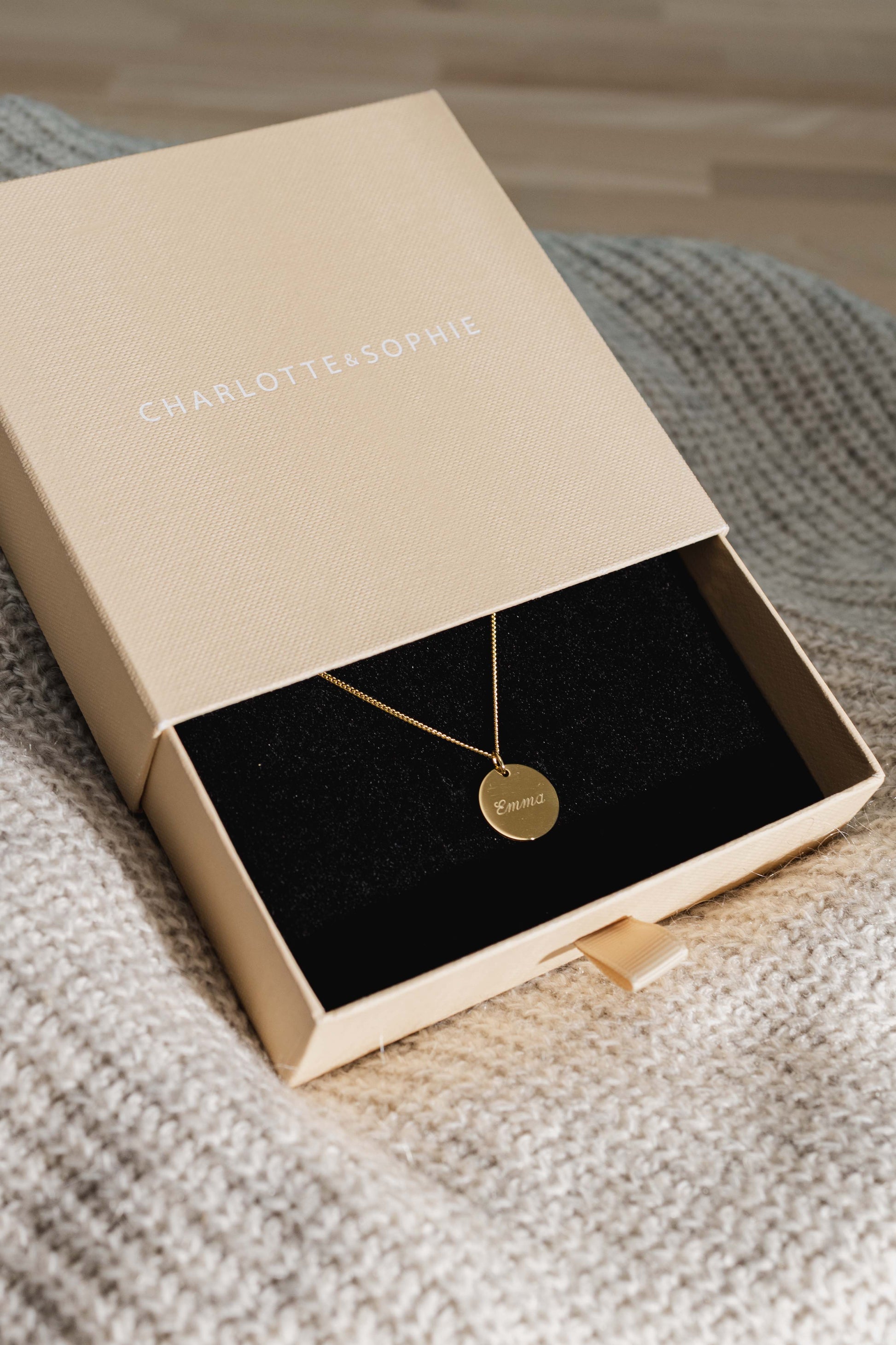 Entscheide Dich für Deine Wunschgravur: Initialen oder einen ausgeschriebenen Namen. Hierfür einfach die Auswahl im vorgesehenen Feld eingeben. Je nach Schmuckstück sind unterschiedliche Optionen möglich. Die Kette KIND bietet zum Beispiel nur Platz für ein Initial, bei der Kette EMBRACE kannst Du einen Namen integrieren, bei der Kette GRACE ist Platz für bis zu vier Initialen. Sollte Deine Wunschoption nicht hinterlegt sein, dann schreibe uns unter hello@charlotteandsophie.de oder hinterlasse beim Check Out im Textfeld eine Nachricht für uns. Wir versuchen, alles möglich zu machen und beraten Dich sehr gerne auch persönlich.