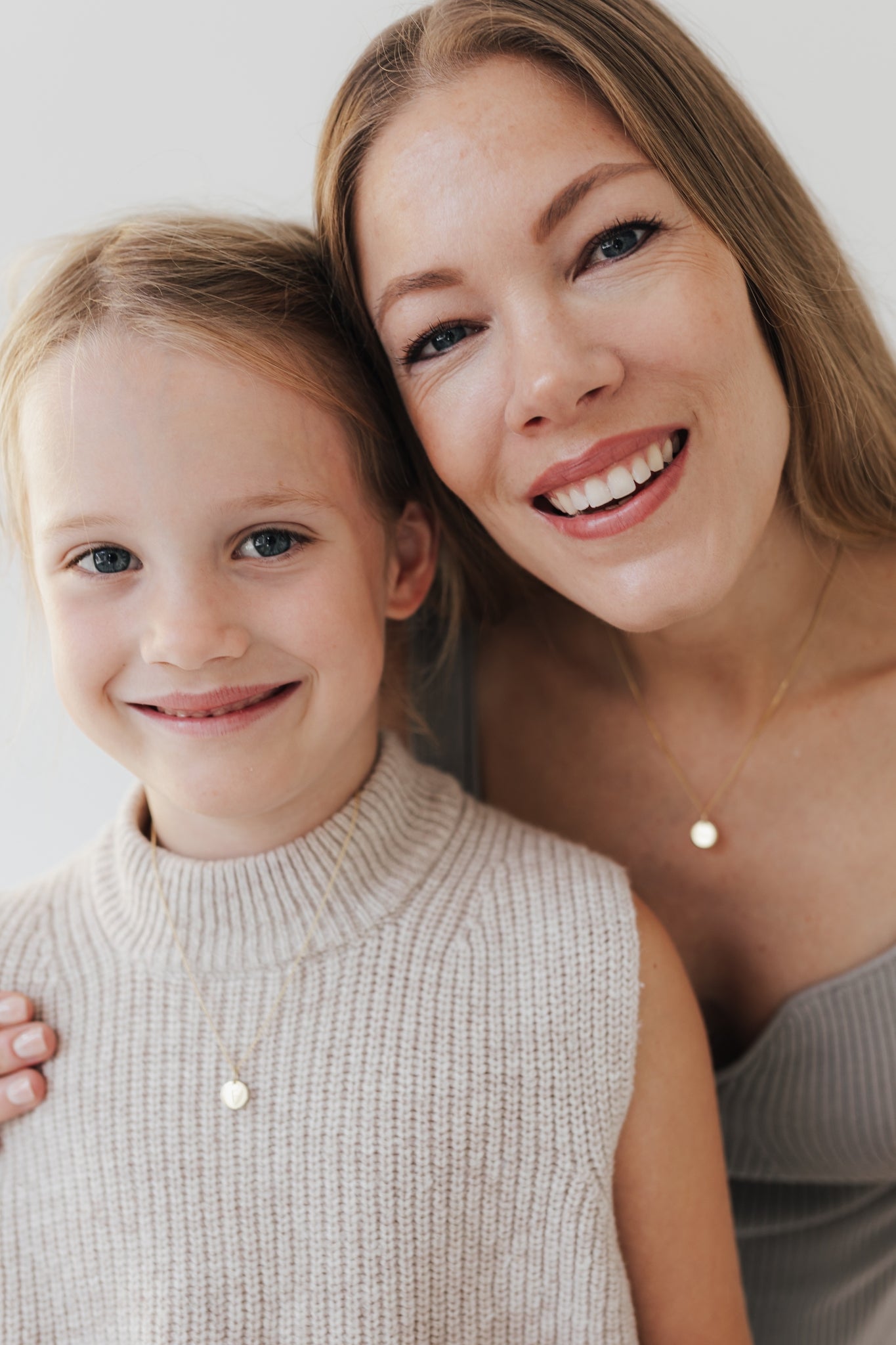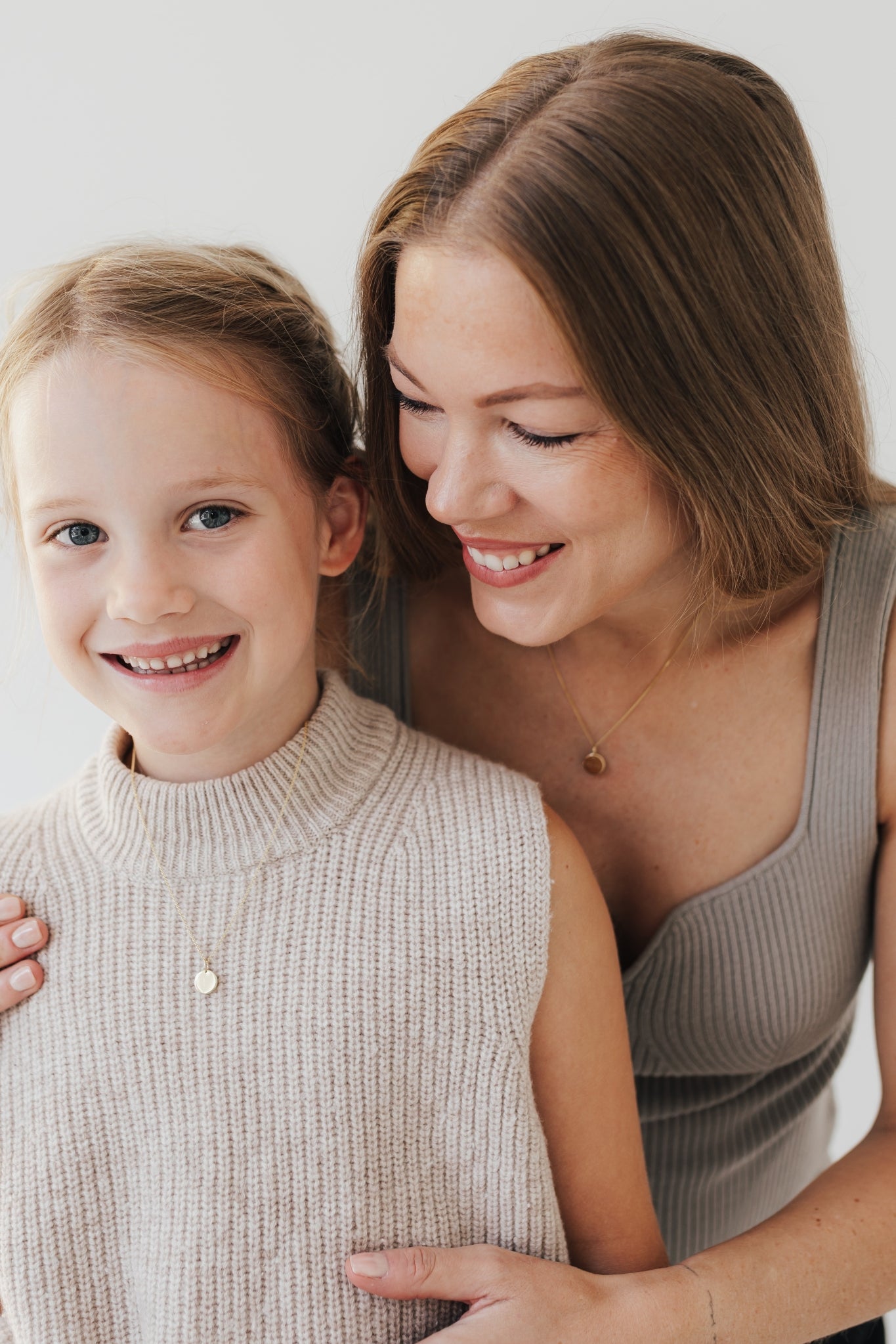 Das The Bond Set vereint zwei feine Echtgoldketten – eine für Mama, eine für Tochter. Kette KIND und Kette AURA. Beide Ketten tragen ein rundes 10 mm Plättchen, das auf Wunsch mit einem persönlichen Initial graviert werden kann.