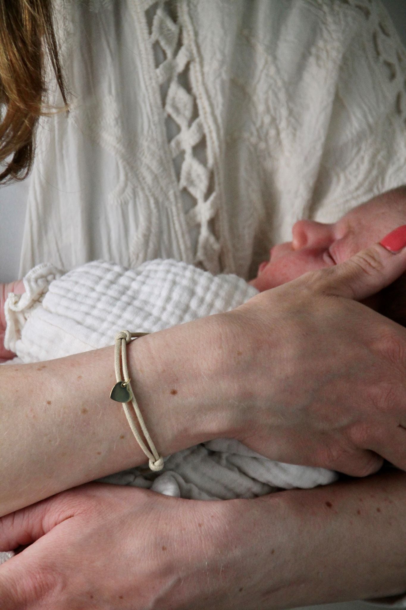 Beiges Stoffarmband (größenverstellbar) inkl. 10 mm Herz als Anhänger